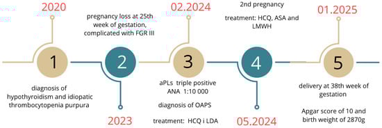 During the rheumatological follow-up in May 2025, the patient was in a good general state and did not have any new manifestations of autoimmune diseases; the results of her laboratory tests did not show any abnormalities, especially thrombocytopenia and abnormalities in clotting times. The patient is still under rheumatological follow-up, continuing treatment with HCQ 200 mg/d and ASA 75 mg/d. She currently does not meet the criteria for systemic lupus erythematosus (SLE) or any other connective tissue disease (CTD) (Figure 2).