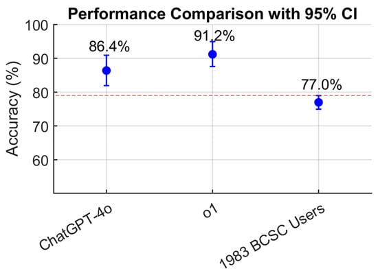 Comparison of ChatGPT-4o, OpenAI-o1, and resident performance displayed as a dot plot with 95% confidence intervals, illustrating the higher accuracy of both models relative to the resident average. The red dashed line indicates the value of the upper CI of the residents’ score (79%).