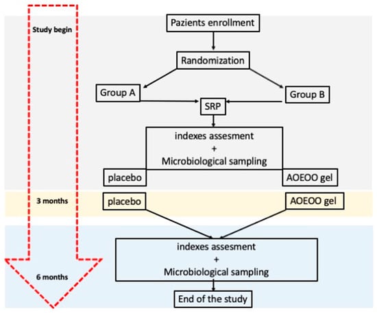 This single-center, double-blind, randomized clinical and microbiological trial was conducted in accordance with the CONSORT-Outcomes 2022 extension statement. The study aimed to investigate the clinical and microbiological effects of locally applied Activated Ozonated Extra-Virgin Olive Oil (AOEOO) in the management of periodontal pockets over a 6-month period. The study was registered at ClinicalTrials.gov (ID: NCT06980675, 11 January 2024). Ethical approval was obtained from the Local Ethical Review Board in Bari (Study No. 7493, Prot. No. 0015250, 20 January 2021), and the study adhered to both institutional and international ethical standards, including the Declaration of Helsinki. All participants provided written informed consent.