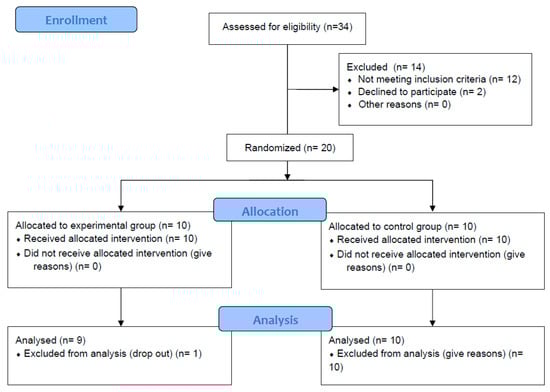 Twenty adult patients with stroke of vascular etiology in the subacute and chronic phase presenting sensorimotor alterations of the affected upper extremity, as well as low-load motor recruitment deficits at trunk and pelvic stabilizers levels, were recruited (Figure 2). The final sample consisted of 19 participants with a global median age of 63 (range 54–67). Descriptive data of the sample are shown in Table 1. There was only one loss in the study, prior to the process of random assignment to the corresponding group, due to dropout. There was no need to perform intention-to-treat analyses since 100% of the subjects initially assigned to groups were finally analyzed. No adverse events were identified in any of the study groups.