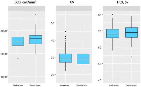 The distributions of endothelial cell density, coefficient of variation, and percentage of hexagonal cells in the study and control groups.