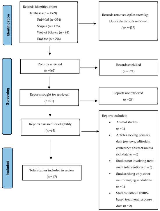 A total of 47 studies met the inclusion criteria for this scoping review. These studies, published between 2009 and 2025, reflect a growing interest in the application of fNIRS for monitoring treatment response in psychiatric populations. Figure 2 presents the annual distribution of publications, illustrating temporal trends in the use of fNIRS as a neuroimaging tool within clinical psychiatry.