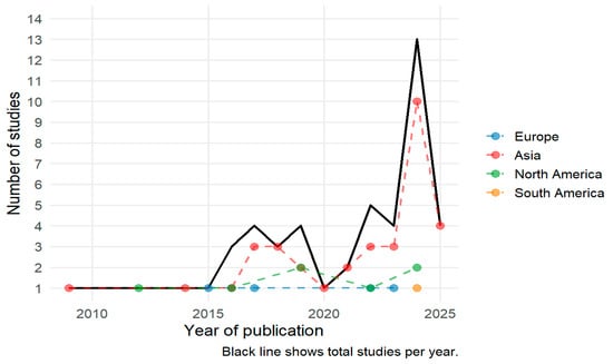 The use of fNIRS to assess treatment response in psychiatric populations has increased over the past decade, with a sharp rise in publications observed after 2020. This growth is driven primarily by studies conducted in Asia [16,32,34,37,42,43,44,45,46,52,53,54,55,56,57,58,59,60,61,62,63,64,65,66,67,68,69,70,71,72,73,74], which account for the majority of contributions in recent years. Europe [17,18,75,76,77], South America [35], and North America [78,79,80,81,82,83] also show modest but steady activity. This overall increasing trajectory suggests a progressive integration of fNIRS into research and clinical frameworks aimed at evaluating neurofunctional changes associated with psychiatric interventions.