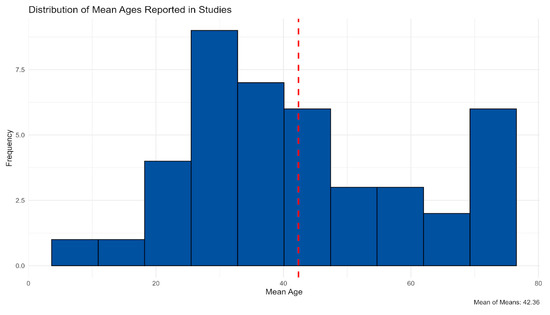 The majority of samples comprised adults (93.6%), with few studies targeting children (6.4%) [64,69,81]. Most studies included mixed-gender samples (85.1%), though a small subset investigated only male (10.6%) [34,53,56,62,65] or female (4.3%) [67,84] participants. Age distribution (Figure 3) skewed toward adults aged 18–64 (44.7%), with additional representation of older adults (12.8%) and mixed-age samples (25.5%). Very few studies focused exclusively on children or adolescents (4.3% each), and 4.3% did not report age [59,82].