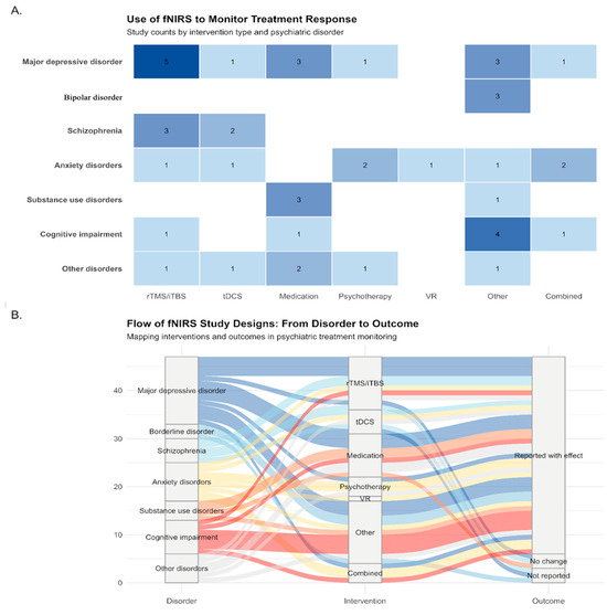 Use of fNIRS to Monitor Treatment Response Across Psychiatric Disorders. (A) Heatmap showing the number of studies employing fNIRS across different psychiatric diagnoses and intervention types. Most research has focused on MDD, schizophrenia, and anxiety disorders, particularly in conjunction with rTMS/iTBS and pharmacological interventions. (B) Sankey diagram illustrating the flow from diagnosis to intervention and reported clinical outcomes. The majority of studies report positive fNIRS-clinical correlations, though representation varies across disorders. Gaps in combined or VR-based therapies suggest potential avenues for future research.