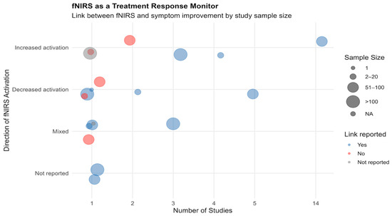 Bubble plot to illustrate fNIRS use to monitor treatment-related brain activation in relation to symptom improvement across psychiatric studies (N = 47). The x-axis represents the number of studies reporting each combination of activation pattern and clinical link, while the y-axis categorizes the direction of fNIRS activation observed post-treatment: increased, decreased, mixed, or not reported. Each bubble is sized according to sample size category, ranging from single-subject designs to studies with over 100 participants. Bubble color indicates whether a link between fNIRS signal change and clinical improvement was reported (Yes = blue, No = red, Not reported = grey).
