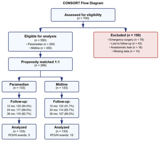 Of 700 patients, 550 met inclusion criteria after excluding 150 patients (78 emergency surgeries, 42 lost to follow-up, 16 anastomotic leaks, 14 missing data) (Figure 1). Before matching, significant baseline differences existed between paramedian (n = 200) and midline (n = 350) groups, with paramedian patients being younger (65.2 vs. 71.4 years, p < 0.001) and having lower comorbidity burden (ASA ≥ 3: 32.0% vs. 48.0%, p < 0.001) (Table 1 and Supplementary Table S1).