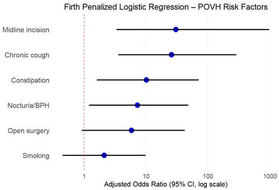 In multivariate Firth penalized regression, three independent predictors emerged: midline extraction (aOR 30.3, 95% CI: 3.34–969, p < 0.001), chronic cough (aOR 25.6, 95% CI: 3.56–287, p = 0.001), and constipation (aOR 10.1, 95% CI: 1.60–70.7, p = 0.015). Model discrimination was excellent (C-statistic = 0.941) (Table 6, Figure 2).