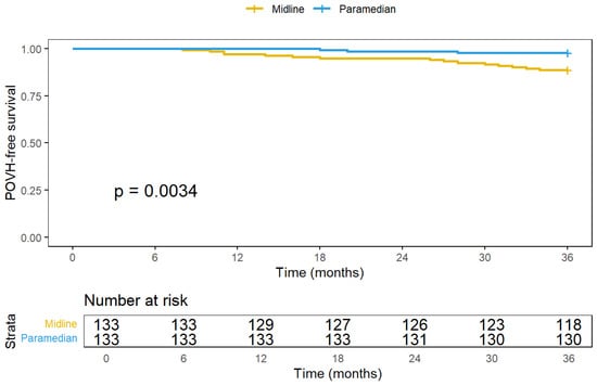 Event-free analysis and Kaplan–Meier analysis demonstrated a superior POVH-free period for paramedian extraction (log-rank p = 0.004, HR 5.28, 95% CI: 1.52–18.3): at 12 months, 100% vs. 97.0%; at 24 months, 98.5% vs. 94.7%; at 36 months, 97.7% vs. 88.7%. Median time to POVH was 22 months (IQR: 14–28) (Figure 3).