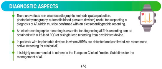 An early diagnosis of AF is crucial to prevent stroke and other consequent complications [13]. The updated European and American guidelines state that AF diagnosis should be confirmed by a specialist physician using an ECG [7,8], preferably a 12-lead ECG, and documenting episodes that last at least 30 s [7]. In accordance, experts recommend adhering to the European Clinical Practice Guidelines for the management of AF, and both the answers to the questionnaire and the practical recommendations highlight the importance of an electrocardiogram for diagnosing AF. This can be obtained with a single-lead recording from a validated device or, otherwise and preferably, with a 12-lead ECG.
