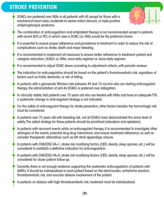 The mainstay treatment for preventing thromboembolic events in patients with AF consists of oral anticoagulants (OACs) [7], and currently, direct oral anticoagulants (DOACs) are preferred over vitamin K antagonists (VKAs). For decades, VKAs were the only option, despite their slow onset, numerous interactions with food and other drugs, and the requirement of regular monitoring of coagulation [7]. In recent years, DOACs, which include apixaban, edoxaban, rivaroxaban, and dabigatran, have become the treatment of choice for the prevention of stroke and systemic embolism in patients with non-valvular AF, as recommended by the main international clinical practice guidelines [7,8].