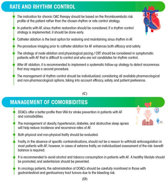 The presence of specific diseases or lifestyle habits might increase the risk of developing AF and may influence the choice of anticoagulant therapy [8,14]. The European guidelines on AF have given special attention to comorbidities both through the ABC pathways in previous editions and through the AF-CARE framework in the updated ones [7,34]. These strategies place the comprehensive care of concomitant diseases as the initial central component of the management of patients with AF [7]. In this regard, experts recommended that appropriately different concomitant diseases [such as obesity, hypertension, diabetes, and obstructive sleep apnea (OSA)] be managed to improve recurrence rates and the incidence of AF. Notably, in the case of OSA, treatment with continuous positive airway pressure has been shown to improve electrophysiological outcomes following AF ablation [35]. Overall, direct oral anticoagulants offer a better profile for stroke prevention in patients with AF and comorbidities.