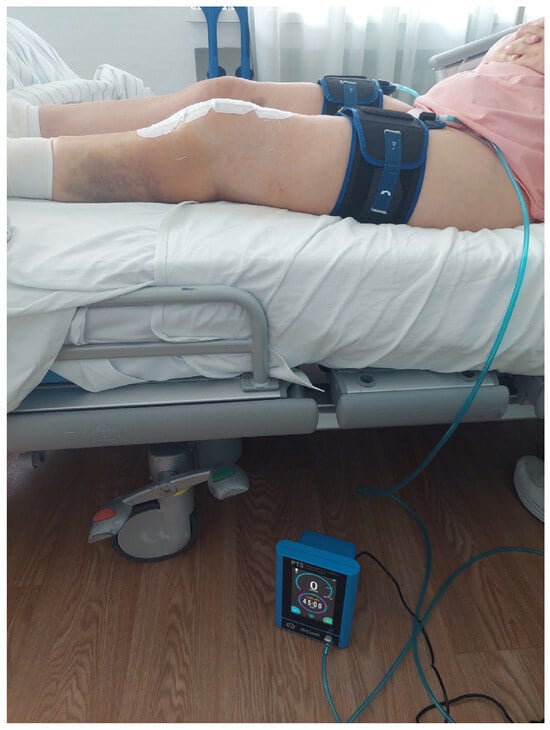 Example of a passive blood flow restriction application after total knee arthroplasty surgery during the hospitalization phase.