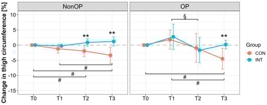Percentage changes in thigh circumference for the operated (OP) and nonoperated leg (NonOP) during the pre- and postoperative periods. Data are provided as mean ± standard deviation. T0, before surgery; T1, post-hospitalization; T2, six weeks post-surgery; T3, three months post-surgery; CON, control group; INT, intervention group. # p < 0.01, significant difference between time points within CON § p < 0.01, significant difference between time points within INT, ** p < 0.01, significant difference between groups.