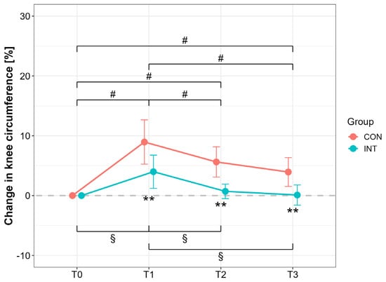Knee circumference increased postoperatively in both groups (T1 vs. T0, p < 0.001; CON: d = 3.42, 95% CI [1.62, 3.42]; INT: d = 2.04, 95% CI [0.74, 3.28]), but to a lesser extent in INT (p < 0.001; CON vs. INT: d = 1.52, 95% CI [0.49, 2.50]). At T3, only INT returned to baseline (T0 vs. T3, p = 1.00, d = −0.08, 95% CI [−0.95, 0.80]), while CON remained elevated (T0 vs. T3, p < 0.001, d = −2.32, 95% CI [−3.45, −1.14]). Between-group differences were significant at both T2 and T3 (p < 0.001), with large effects (T2: d = 2.48, 95% CI [1.17, 3.75]; T3: d = 1.85, 95% CI [0.75, 2.92]) (Figure 3).