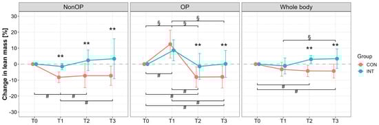 Lean mass (DXA) of the OP leg at T0 was 7961 ± 1844 g (CON) and 8636 ± 1287 g (INT); NonOP leg: 8445 ± 2162 g (CON), 8579 ± 1143 g (INT). For the NonOP leg, significant group (p < 0.001) and interaction effects (p = 0.02) were observed, with large reductions only in CON from T1 to T3 compared with T0 (p ≤ 0.05, T0 vs. T1: d = 3.54, 95% CI [1.69, 5.35]; T0 vs. T2: d = 1.38, 95% CI [0.27, 2.43]; T0 vs. T3: d = 1.70, 95% CI [0.50, 2.84]) (Figure 4). OP leg lean mass in INT remained stable (p = 1.00, T0 vs. T2: d = 0.25, 95% CI [−0.64, 1.13]; T0 vs. T3: d = −0.03, 95% CI [−0.90, 0.85]), while CON showed significant declines with large effects (p < 0.01, T0 vs. T2: d = 1.79, 95% CI [0.57, 2.96]; T0 vs. T3: d = 1.62, 95% CI [0.45, 2.75]). Whole-body lean mass declined in CON p ≤ 0.05, T0 vs. T2: d = 1.69, 95% CI [0.50, 2.82]; T0 vs. T3: d = 1.41, 95% CI [0.30, 2.47]), but increased in INT with a large effect (T1 vs. T3, p = 0.03, d = −0.81, 95% CI [−1.72, −0.11]). Group differences were significant at T2 and T3 (p < 0.001), with large effects (T2: d = 2.37, 95% CI [1.20, 3.54]; T3: 1.46, 95% CI [0.45, 2.44]).