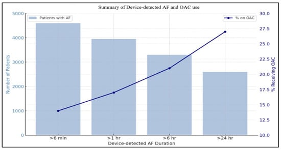 Despite knowledge of the measurable risk of stroke in this population, there is a significant variability in clinical practice regarding OAC initiation in patients with device-detected atrial fibrillation. For instance, in a retrospective study conducted by Perino et al., there was a significant difference in the rates of OAC prescription in SCAF. While the prescription rate was 16% in individuals with SCAF duration >1 h, the rates only reached 27% amongst patients with SCAF duration >24 h, which has been demonstrated in the ASSERT (The Asymptomatic Atrial Fibrillation and Stroke Evaluation in Pacemaker Patients and the Atrial Fibrillation Reduction Atrial Pacing Trial) trial to be associated with a higher risk of stroke (Figure 2) [8,9].