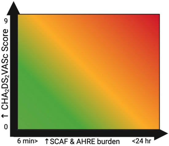 Moreover, trials such as TRENDS and ASSERT have established arrhythmic burden—defined by the cumulative duration and frequency of subclinical atrial fibrillation (SCAF) episodes—as a stronger predictor of thromboembolic events than isolated, single-episode duration. In the TRENDS study, patients with a daily SCAF burden exceeding 5.5 h had an annual stroke risk of approximately 2.4%, more than double that of those with lesser burden [4]. On the other hand, ASSERT, which followed 2455 pacemaker/ICD patients over 2.5 years, categorized the longest SCAF episodes: 18.8% experienced episodes lasting over 6 min to 6 h, 6.9% had durations of 6–24 h, and 10.7% had episodes longer than 24 h [10]. Most notably, episodes > 24 h were linked to a significant 3.24-fold increase in risk of ischemic stroke or systemic embolism (adjusted HR 3.24; 95% CI 1.51–6.95; p = 0.003). Meanwhile, shorter episodes (<24 h) were not associated with statistically significant elevated risk. These findings underscore that overall SCAF burden, not just the longest individual episode, is a powerful independent prognostic marker for thromboembolic events.