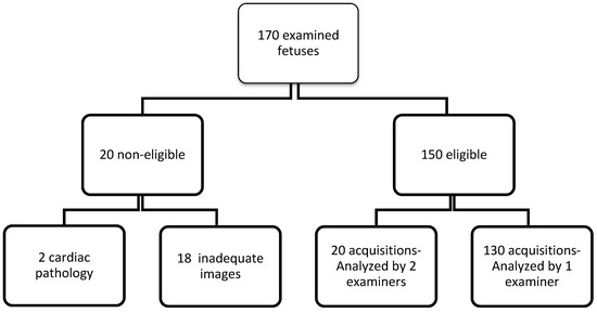 We conducted a prospective, single-center study in the Pediatric Cardiology Department of the Emergency Institute for Cardiovascular Diseases and Heart Transplant in Targu-Mures, Romania, between 27 February 2021 and 27 August 2023, a time frame in which 170 fetuses underwent echocardiographic evaluation, with gestational ages ranging between 22 and 39 weeks. The inclusion criteria for this study were as follows: fetuses with a normal weight for their gestational age and physiological, singleton pregnancies free from both maternal and fetal pathologies. Fetuses with intrauterine growth retardation, cardiac or extracardiac malformations, or rhythm or conduction disorders; twin pregnancies; pregnancies affected by maternal pathologies (diabetes, hypertension); and cases in whom the echocardiographic acquisitions were suboptimal (maternal obesity, difficult fetal position), respectively in whom acquisition of 4-chambers view images with a framerate over 80 was not possible were excluded from the study (Figure 1).