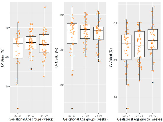 The distributions of regional and global longitudinal strain measurements stratified by gestational age groups are depicted graphically in Table 2 and Figure 2, Figure 3, Figure 4 and Figure 5.