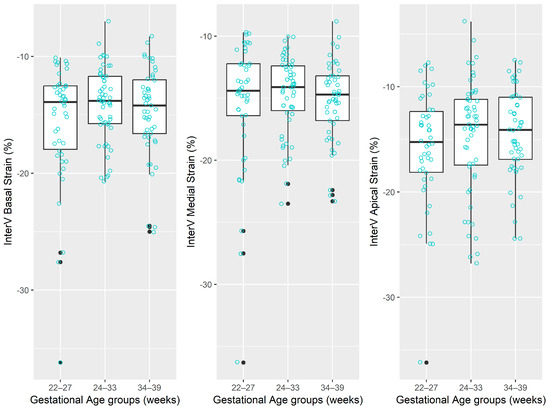 The distribution of values for interventricular septum strain measurements. Note: for each box-and-whisker plot, the box contains the data range from the lower to upper quartile (25th to 75th percentile), while the middle line denotes the median, and the points represent the measured strain values. The black dot points represent outliers automatically detected by the boxplot method.