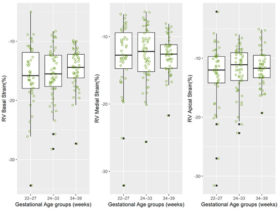 In the intrauterine period, the RV is the dominant ventricle, having a larger pre- and afterload compared to the LV. The longitudinal strain does not capture this aspect, taking into account the fact that due to the immaturity of the fetal and neonatal myocardium, an increase in preload does not result in an increase in contractility. The stability of RV strain values was also observed in longitudinal studies, such as the one performed by Maskatia et al., who followed 60 pregnant women between 20 and 38 weeks of gestation [16], and also several cross-sectional studies [19,20,21].