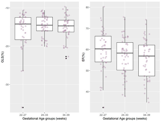 The results of Welch’s ANOVA model showed no significant difference in right-ventricle peak global longitudinal strain between gestational age groups (F [2.0, 92.2] = 0.52, p = 0.5972) and global longitudinal strain measurements (F [2.0, 89.6] = 27.00, p = 0.3733).