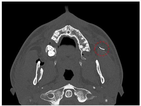 Axial computed tomography (CT) image demonstrating the presence of a suture needle within the left masticatory space. The foreign body is indicated by a dotted circle.