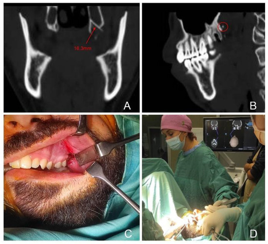 CT Coronal and sagittal scans locating the foreign body in the left pterygopalatine space (A,B); intraoperative removal from transoral approach and using CT-based intraoperative navigation (C,D). The foreign body is indicated by a dotted circle.