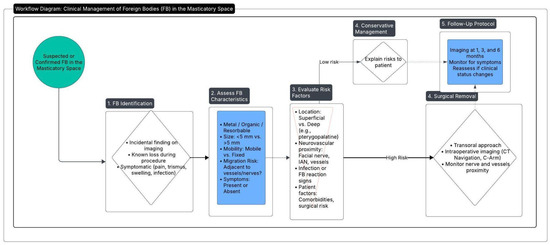 This diagram outlines the process for managing a suspected or confirmed foreign body (FB) in the masticatory space. The 5 steps process includes identifying the FB, assessing its characteristics and risks, and deciding on a treatment approach based on risk assessment.