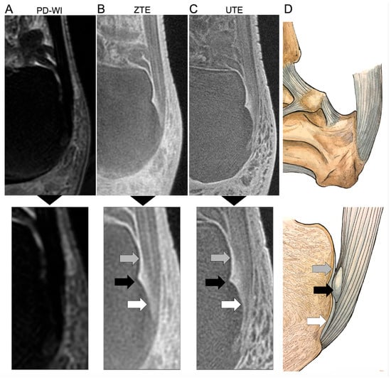17], our results demonstrated the strong improvement of both UTE and ZTE for the in vivo visualization of the three fibrocartilages constituting the Achilles enthesis. The PCa, SCa, and ECa were concomitantly observed in 92.1% of volunteers using UTE and 72% volunteers using ZTE against 0% of volunteers using PD-WI. Furthermore, UTE demonstrated better image quality, with 92.1% of acquisitions rated as high quality compared to 42.1% for ZTE. Additionally, UTE sequences provided superior visualization of the SCa (92.1% versus 72% for ZTE) and were preferred by readers in 68.4% of cases compared to 13.2% for ZTE. It must be emphasized that the accurate depiction of normal and pathological SCa would be crucial in studies involving patients with seronegative spondyloarthropathies, as this area is often affected in early disease stages. Li et al. observed abnormal vascularization in the peri-sesamoidal area of spondyloarthropathy patients using CDUS [