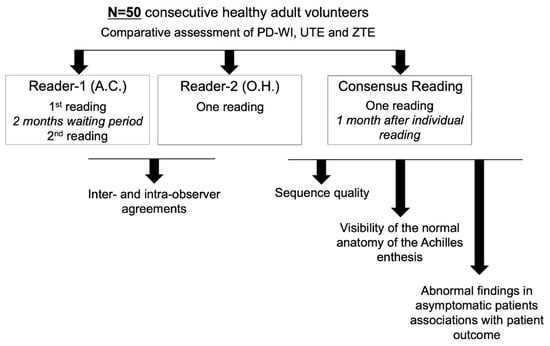 Figure 2 represents the study workflow illustrating the different readings performed on the dataset and the subsequent analysis performed on these readings (i.e., the assessment of intra- and inter-observer agreements, sequent quality, visibility of the normal anatomy of the Achilles enthesis organ, and observations of abnormal findings in asymptomatic patients).