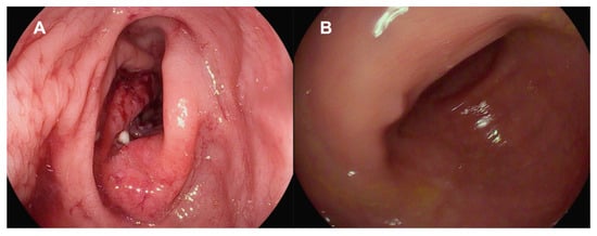 (A) Semicircular, ulcerating mass at the rectosigmoidal junction with irregular margins, consistent with a neoplastic process, without signs of perforation or obstruction. (B) Complete resolution of inflammation after antibiotic treatment.