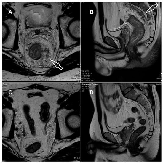 MRI of the rectum at presentation (A,B) and after 3 months (C,D). (A,B) T2-weighted axial (A) and sagittal (B) at initial presentation, showing long-segment, circumferential thickening of the rectal wall (white arrows) with marked mural irregularities, edema, perineural and perivascular infiltration; multiple lymph nodes with irregular shape within and beyond the mesorectal fascia, extending to the external iliac region. Infiltration of the mesorectal fascia and peritoneum with mucosal diffusion restriction. Mild pelvic ascites. Suspected colorectal carcinoma staged as T4a N2b M1 MRF+ EMVI+. (C,D) After antibiotic treatment, complete regression of the rectal wall and mesorectal fascia thickening; regression of edema and no lymphadenopathy. (MRF = mesorectal fascia, EMVI = extramural vascular invasion).