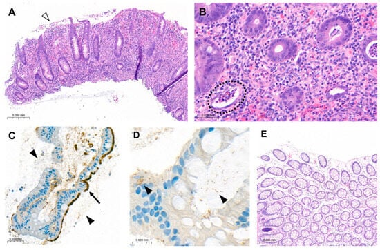 Histology of rectal biopsies taken before (A–D) and after (E) antibiotic treatment. (A) Colon mucosa with increased chronic active inflammation in the lamina propria, erosions (white arrow) and preserved architecture. (B) Cryptitis and crypt abscesses (black circle). (C,D) Immunohistochemistry for T. pallidum highlights superficially distributed spirochetic bacteria on the mucosal surface (arrow) and in crypt lumina (black arrowhead). (E) Unremarkable colon mucosa post antibiotic treatment. H&E hematoxylin and eosin.