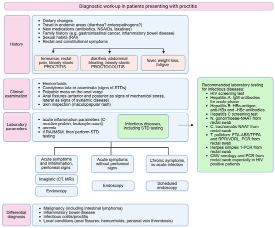 Based on the previously published clinical data on STD proctitis, we suggest a possible algorithm, which can guide a reasonable diagnosis in patients presenting with rectal symptoms (Figure 4).