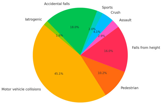 Regarding mechanisms of injury, motor vehicle collisions were the most common, accounting for 45.1% (n = 110) of cases, followed by accidental falls (18.0%, n = 44), falls from height (16.0%, n = 39), pedestrian accidents (10.2%, n = 25), and other causes including crush injuries, assaults, sports, or iatrogenic events (10.7%). Figure 1 illustrates that road traffic trauma represents the predominant mechanism of blunt renal injury in our cohort, consistent with data from other urban trauma centers. According to the AAST renal injury scale, 43.0% (n = 105) of patients sustained low-grade injuries (AAST I–II), whereas 57.0% (n = 139) presented with high-grade injuries (AAST III–V). Figure 2 highlights the over-representation of high-grade injuries, reflecting our institution’s role as a regional referral center for complex trauma.