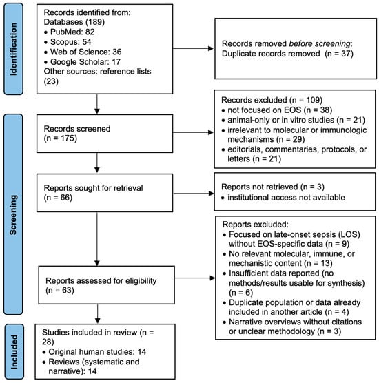 For example, the full PubMed search query used was as follows: (“neonatal sepsis” [MeSH Terms] OR “early-onset sepsis” OR “EOS”) AND (“molecular mechanism” OR “immune response” OR “inflammation” OR “cytokines” OR “biomarkers” OR “gene expression” OR “Toll-like receptor” OR “transcriptome”). A detailed description of all search strings and database strategies is provided in the Supplementary Materials S1.