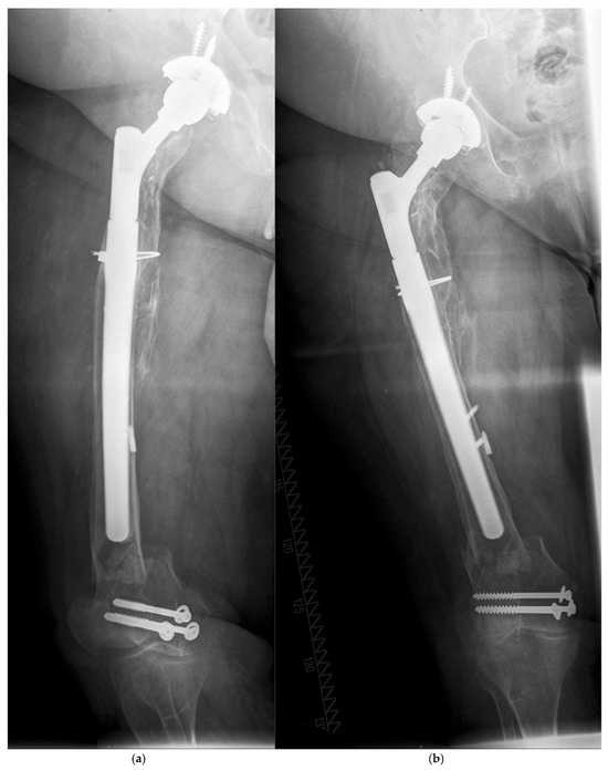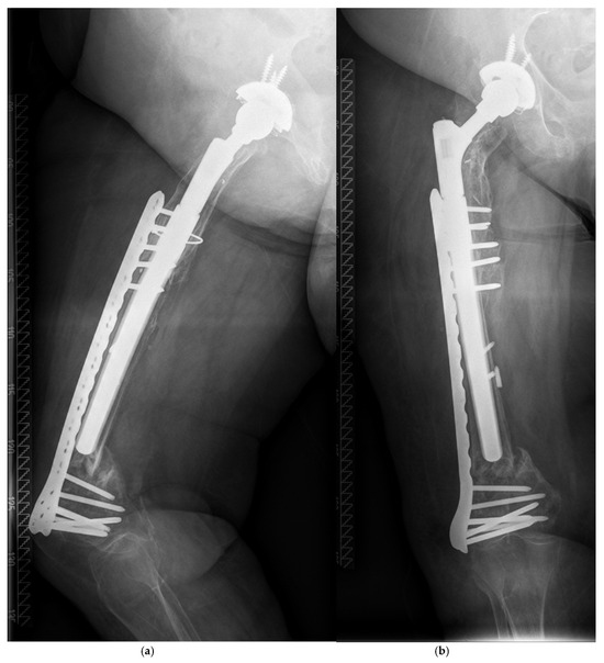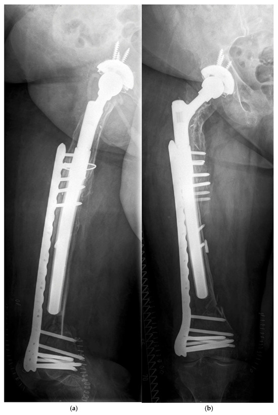 - Yeo, I.; Rhyu, K.H.; Kim, S.M.; Park, Y.S.; Lim, S.J. High union rates of locking compression plating with cortical strut allograft for type B1 periprosthetic femoral fractures. Int. Orthop. 2016, 40, 2365–2371. [Google Scholar] [CrossRef] [PubMed]
