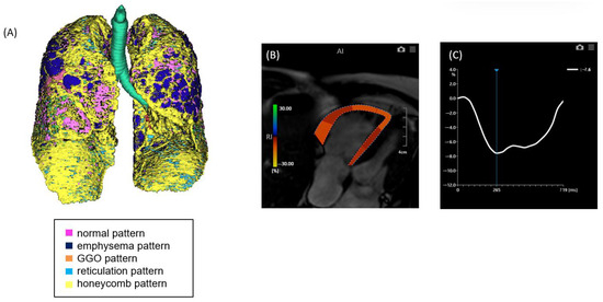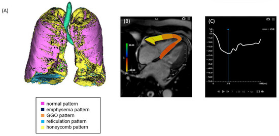A case of ILD with mild pulmonary fibrosis and preserved right ventricular (RV) strain. (A) Quantitative CT-based 3D reconstruction of lung parenchymal patterns. Normal lung parenchyma (pink), emphysema (dark blue), ground-glass opacity (GGO, orange), reticulation (light blue), and honeycombing (yellow) are segmented. (B) Cardiac MRI showing right ventricular strain analysis using feature tracking. (C) Strain–time curve of the right ventricle showing preserved peak longitudinal strain (−23.0%).