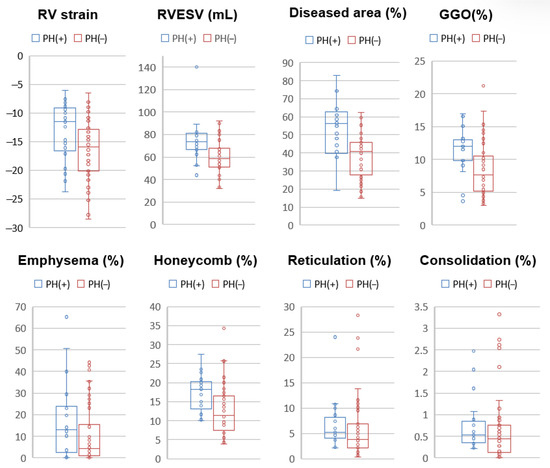 Boxplots of CT and MRI parameters comparing patients with and without pulmonary hypertension (PH). Patients with PH [PH(+), blue] demonstrated significantly impaired right ventricular (RV) function, as indicated by lower RV longitudinal strain (p = 0.026) and higher RV end-systolic volume (RVESV, p = 0.003) compared to those without PH [PH(−), red]. On CT analysis, PH(+) patients exhibited significantly greater diseased lung area (p < 0.001), ground-glass opacity (GGO, p = 0.005), and honeycombing (p = 0.0027). No significant differences were observed for emphysema (p = 0.12), reticulation (p = 0.23), or consolidation (p = 0.27).
