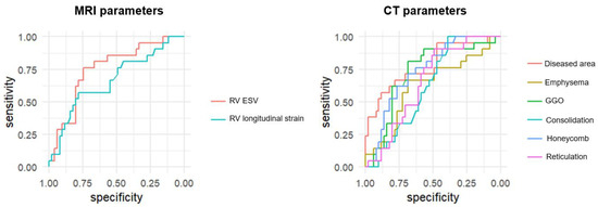 Receiver operating characteristic (ROC) curves of CT and MRI parameters for the diagnosis of pulmonary hypertension (PH). ROC curves compare the diagnostic performance of cardiac MRI-derived parameters (RV strain, RV end-systolic volume [RVESV]) and CT-derived parameters (diseased lung area, ground-glass opacity [GGO], honeycombing, reticulation, consolidation, and emphysema) for detecting PH in patients with interstitial lung disease. The area under the curve (AUC) was highest for diseased lung area (AUC = 0.778), followed by RVESV (AUC = 0.754), honeycombing (AUC = 0.738), and GGO (AUC = 0.724). RV strain showed moderate diagnostic utility (AUC = 0.665), while emphysema, reticulation, and consolidation showed lower diagnostic value.