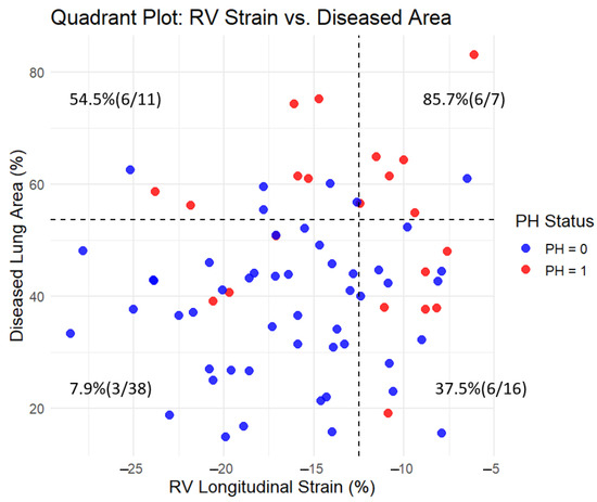 Quadrant plot of RV longitudinal strain and diseased lung area with pulmonary hypertension (PH) prevalence. The plot divides the cohort into four quadrants based on threshold values determined by ROC analysis using the Youden index: −12.5% for RV longitudinal strain (x-axis) and 53.6% for diseased lung area (y-axis). Each dot represents a subject, color-coded by PH status (red = PH present, blue = PH absent). Dashed lines indicate the threshold values. In each quadrant, the percentage and count of patients with PH (n/N) are shown. The prevalence of PH was highest in the upper right quadrant (85.7%, 6/7) and lowest in the lower left quadrant (7.9%, 3/38), demonstrating the combined impact of reduced RV strain and increased lung fibrosis on PH presence.