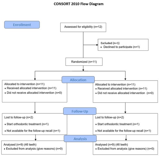 The study included a total of 46 gingival recessions in nine patients (seven women and two men), aged between 19 and 51 years (mean age 36.1 ± 8.46), all of whom completed the 6-month follow-up period (Table 1). Figure 1 shows the CONSORT flowchart diagram reporting the numbers of participants, who were randomly assigned, given intended treatments, and analyzed for the primary outcome of the present study. A total of 46 teeth were included in the study, 23 in the study group (LDGG) and 23 in the control group (DGG). In the study group, there were two lateral incisors (8.7%), nine canines (39.1%), nine first premolars (39.1%), and three second premolars (13%). The control group included one lateral incisor (4.3%), seven canines (30.4%), nine first premolars (39.1%), and six second premolars (26.1%) (Table 1). All patients had good oral hygiene before surgeries and throughout the follow-up period, maintaining API levels of 11.61 ± 1.76 at baseline, 11.95 ± 2.27 3 months post-op, and 12.2 ± 2.12 6 months post-op.