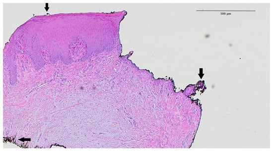 A sample of palatal mucosa subjected to Er,Cr:YSGG laser deepithelialization was fixed in 10% buffered formalin immediately after harvesting. Following fixation, the tissue was dehydrated, embedded in paraffin, sectioned at 5 µm, and stained with hematoxylin and eosin (H&E). Histological evaluation was performed under 40× magnification using a light microscope (Leica DM500, Leica Microsystems, Wetzlar, Germany). The aim was to assess the depth and uniformity of epithelial removal, the integrity of the connective tissue, and the presence of thermal damage. A black ink marker was used to indicate tissue orientation. The analysis confirmed clear epithelial removal without signs of carbonization, coagulation, or connective tissue necrosis.