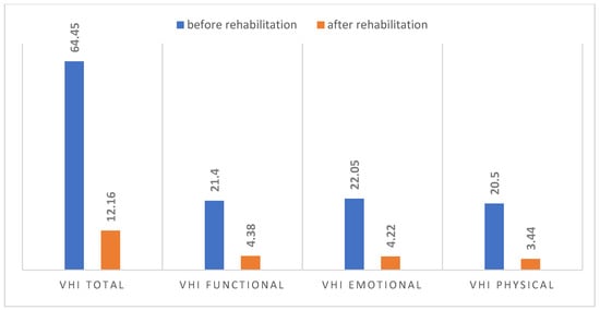 Prior to rehabilitation, the overall VHI score indicated severe voice impairment (64.45), with a standard deviation of 21.27, and a similar degree of voice dysfunction across all scales. To a slight extent, emotional problems prevailed among the respondents (22.05). The voice impairment scores were 21.40 and 20.50 for the functional and physical subscales, respectively. Following voice rehabilitation, the subjects reported a significant improvement in voice quality, with individual scale scores within the normal range. The total score on the VHI scale was 12.16, indicating mild voice impairment, with a standard deviation of 6.98. A comparative analysis of the VHI questionnaire scores before and after rehabilitation is shown in Figure 1.