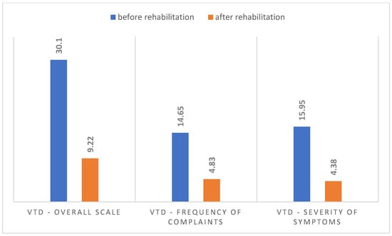 Significant differences in self-assessment before and after rehabilitation were obtained in both the total VDT scale and its subscales—the coefficient of significance was high (p = 0.00), as shown in Table 2.