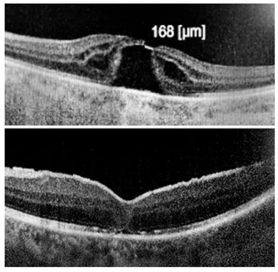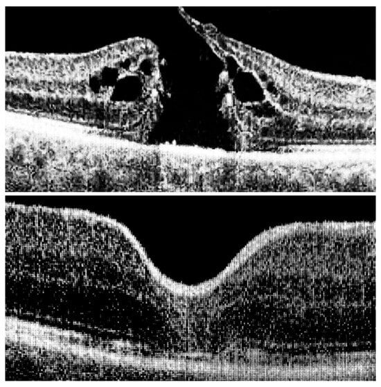 At the top: long-standing macular hole persisting for 12 months; at the bottom: complete closure with restoration of all retinal layers, preserving ideal architecture and morphology, including the ninth layer—the retinal pigment epithelium (RPE).