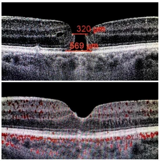 - Baiborodov, Y.V.; Balashevich, L.I. The concept of the foveola anatomical reconstruction in the surgical treatment of full-thickness macular tears using intraoperative OCT control. In Makula-2016; Sv. Fyodorov Eye Microsurgery Institute and North-Western State Medical University: Saint Petersburg, Russia, 2016; pp. 283–294. Available online: https://www.researchgate.net/publication/321091320 (accessed on 23 July 2025).