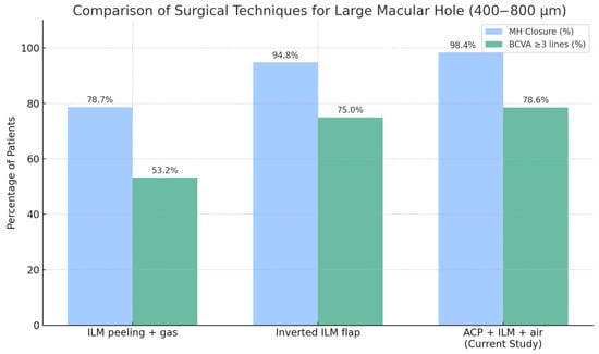 Comparison of the efficacy of different surgical techniques for the treatment of large full-thickness macular holes (400–800 µm). Blue bars represent the MH closure rate, and green bars indicate the percentage of patients with a ≥ 3-line improvement in BCVA. Data for ILM peeling and inverted ILM flap techniques were obtained from the meta-analysis by Chen et al. [14] (2020, PLoS ONE), while data for ACP + ILM peeling + air tamponade originate from the present study.